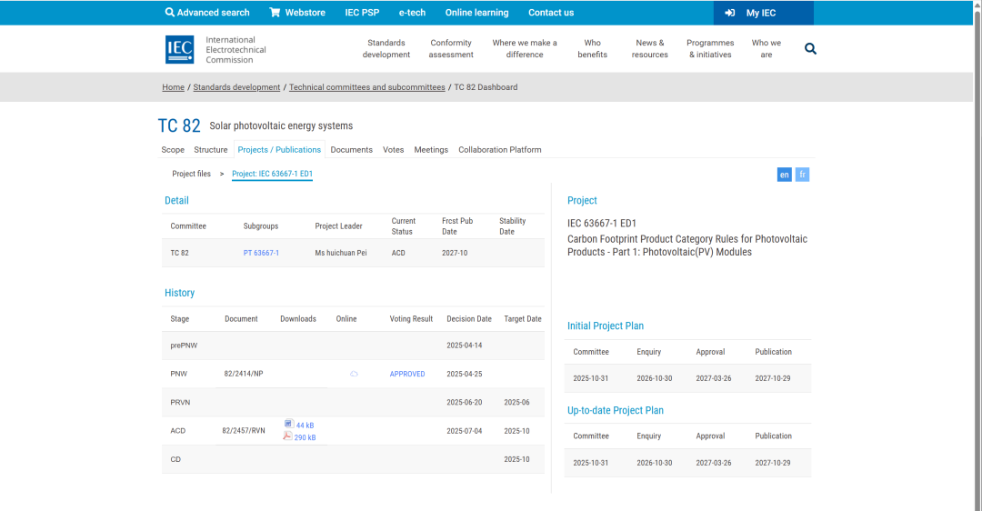 该项外洋法式提案以CESI牵头制定的行业法式 SJ/T 11926-2024《产物碳脚迹 产物种类公法 光伏组件》为技巧基础。依托该行业法式的接头基础及践诺训导,CESI聚首行业大家积极经营,通威积极参与其中并建言献计。2025年4月,该外洋法式在IEC TC82摩洛哥会议上提交立项肯求,经布告处发起公共投票,赞许率达100%。该项外洋法式旨在确立公共结伙的光伏组件全人命周期碳脚迹核算公法与科学数据质料评估模子,将显耀培育碳脚迹因子与原土数据的时空匹配度,破解外洋通用数据库在光伏产物碳脚迹评价中的局限性,为构建愈加盛开、自制、透明的公共光伏市集环境提供蹙迫轨制保险。